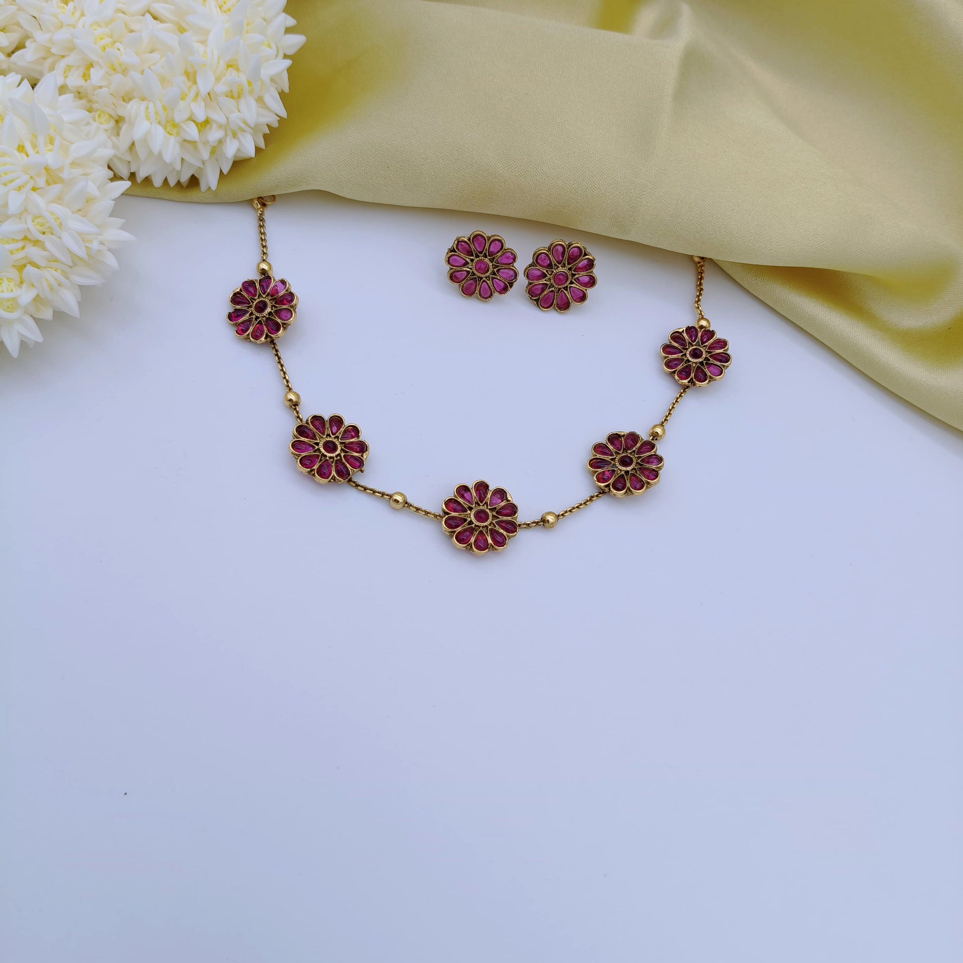 Celebrate the charm of blooming beauty with the Phoolrika Blossom Choker Set, a tribute to nature’s delicate artistry. Each floral motif sparkles with intricate detailing and ruby-toned elegance. Paired with matching earrings, this set brings together sophistication and tradition in perfect harmony.