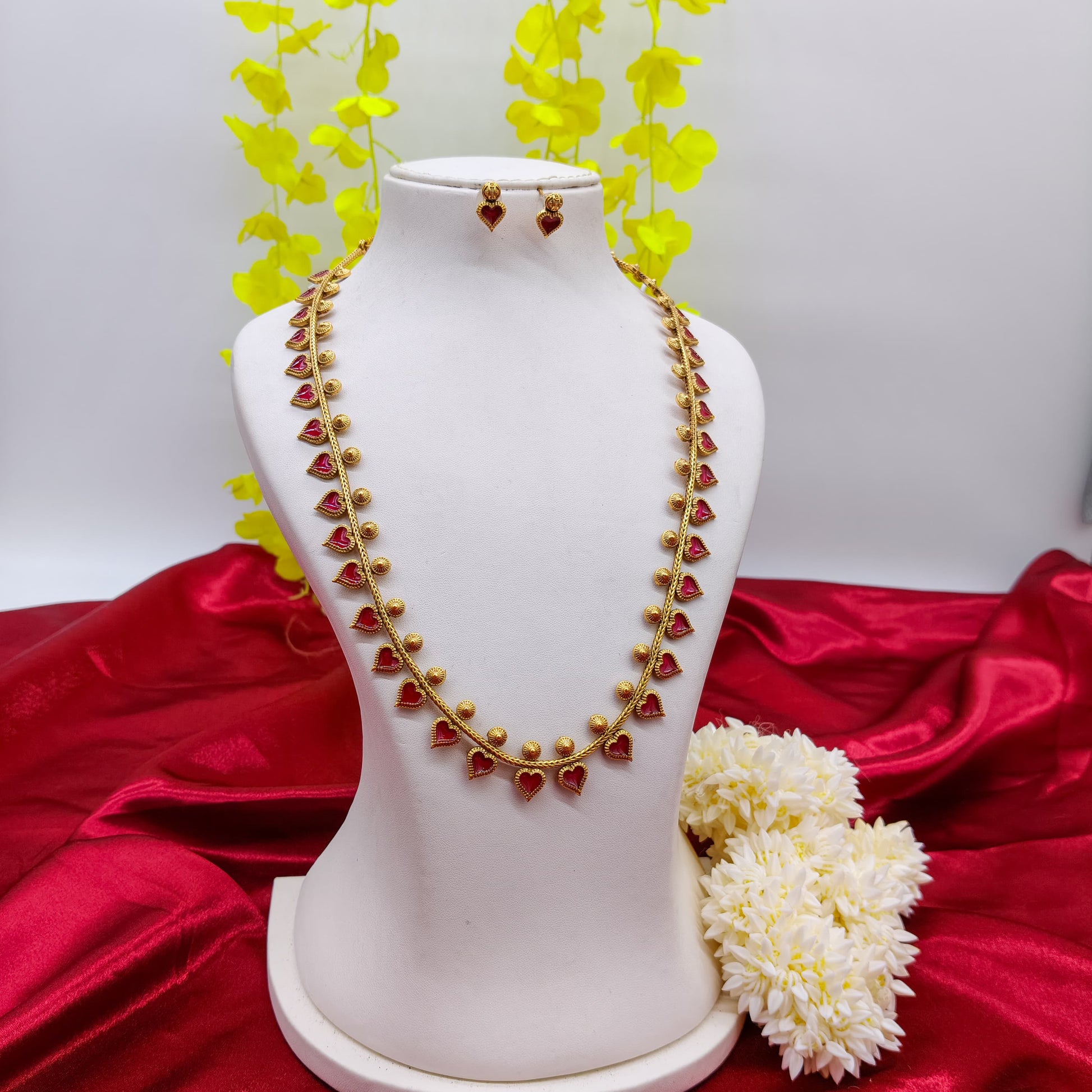 This set features a simple gold-toned necklace with alternating gold beads and red heart-shaped accents, paired with matching small stud earrings.
