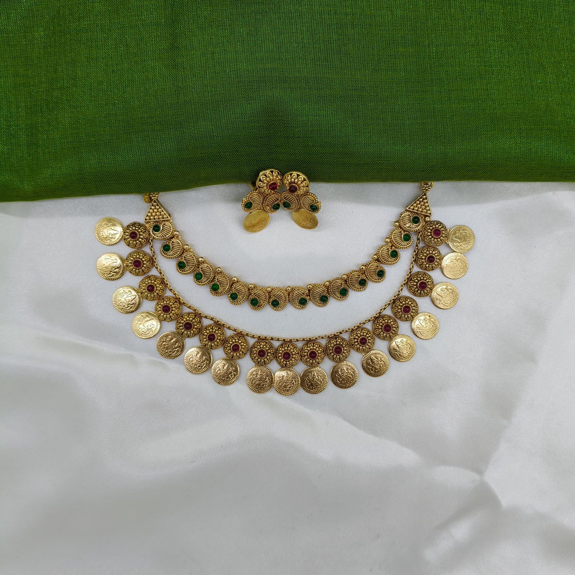 This is a traditional gold-toned coin necklace set with green and pink stone accents, paired with matching coin motif earrings.