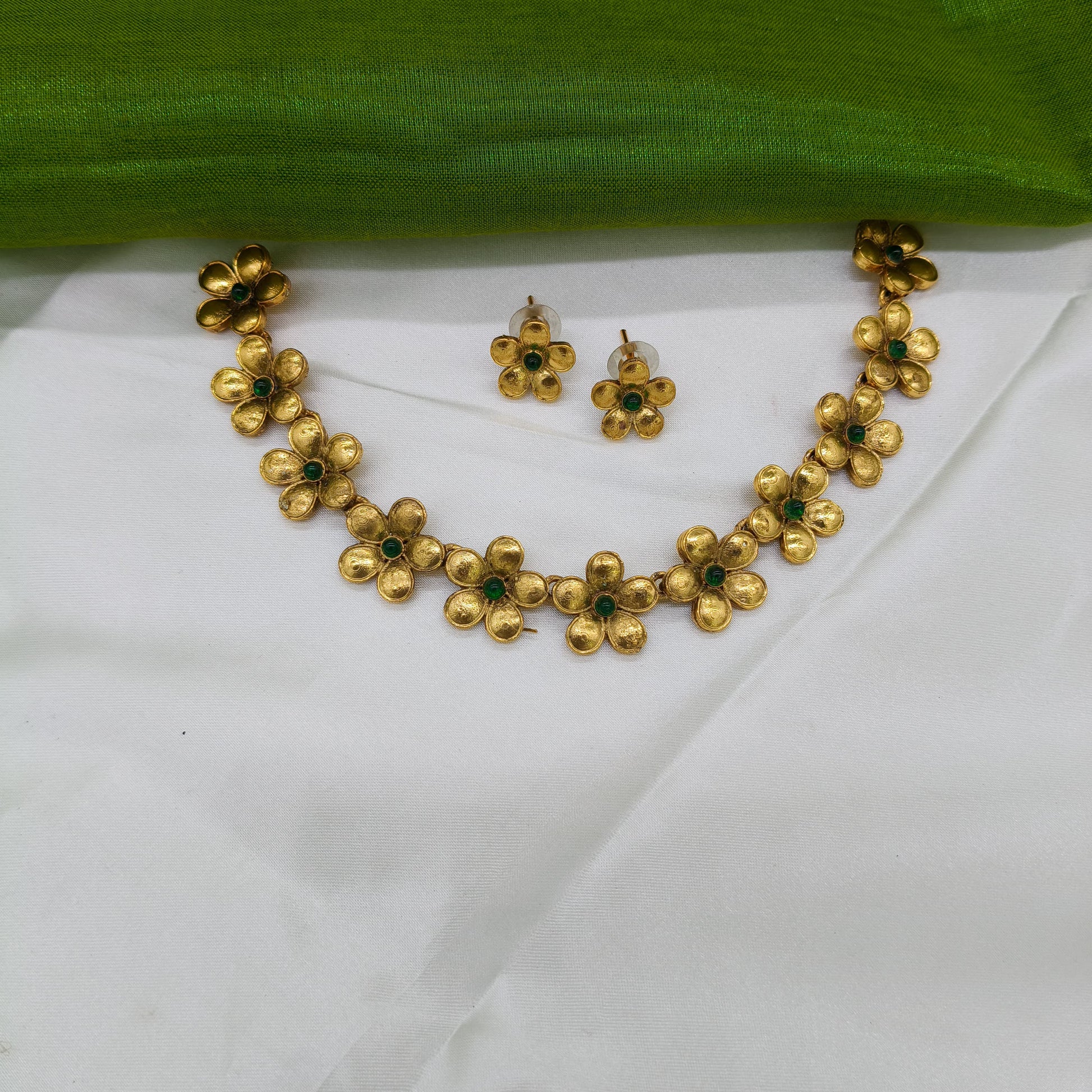 This is a gold-toned necklace set with floral designs, each flower featuring a green stone center, and matching floral stud earrings.