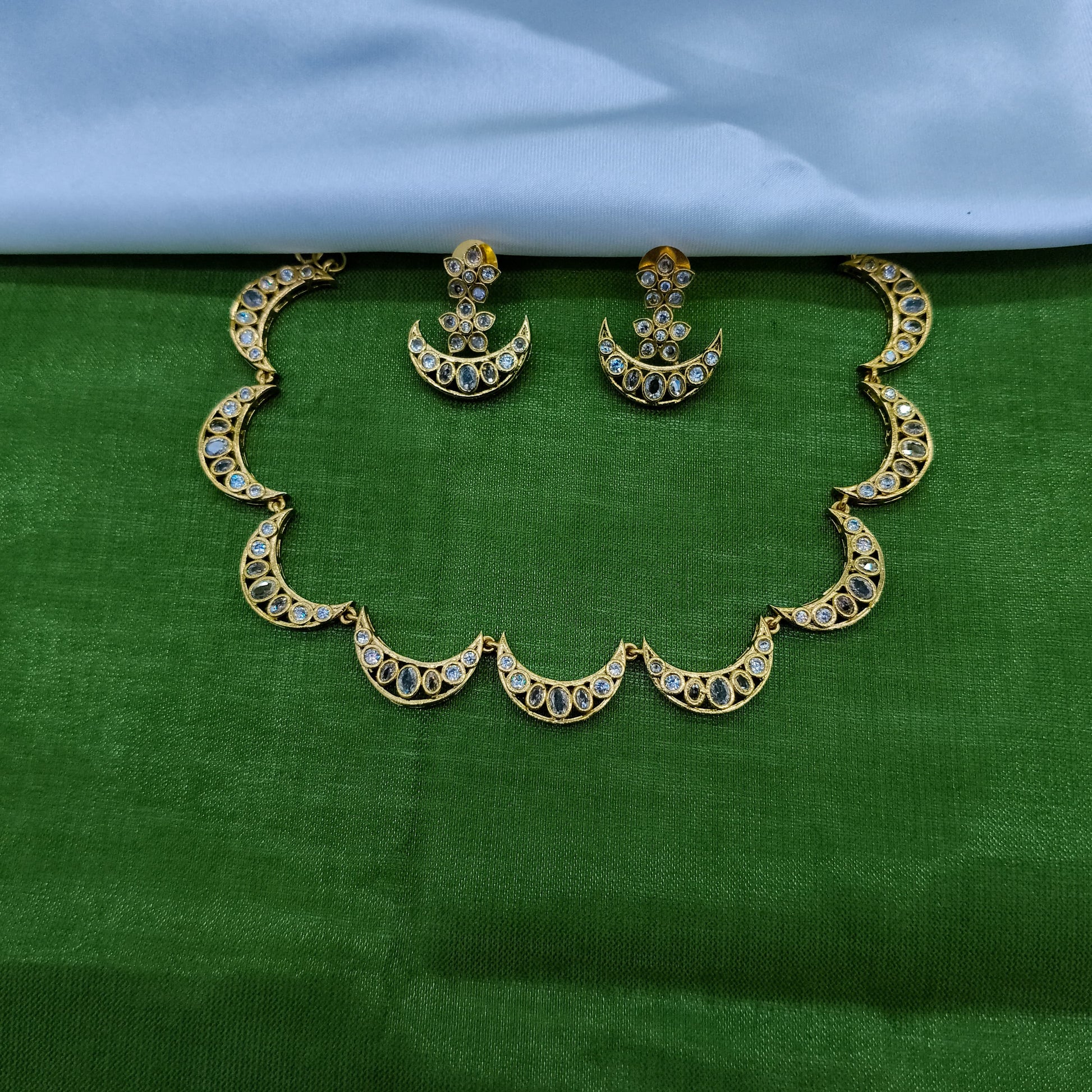 This set features a gold-toned necklace and earrings with a crescent moon pattern, adorned with clear Ad stone detailing for a sparkling finish.