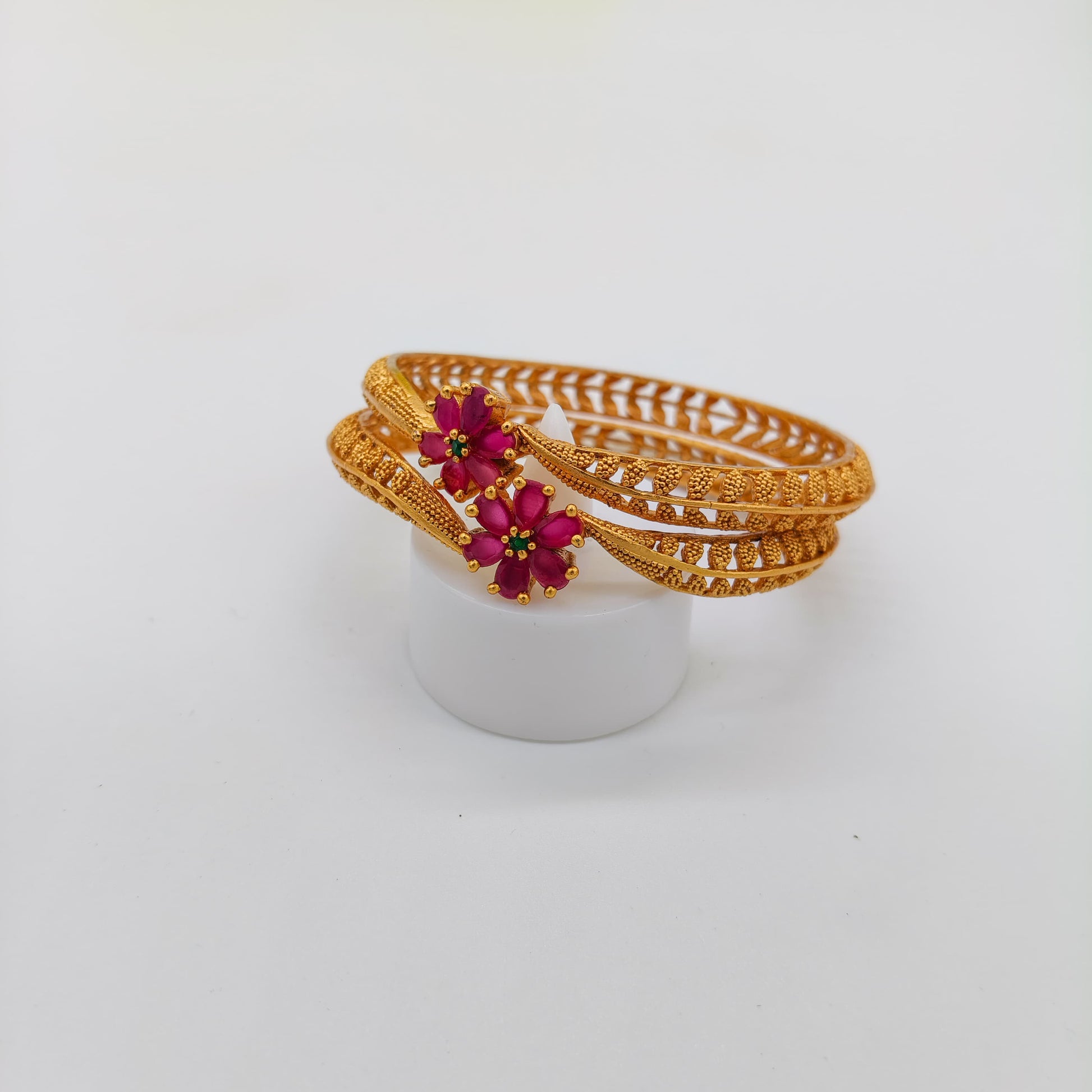 These are gold-toned bangles featuring intricate filigree work and floral designs with red and green stone accents at the center.