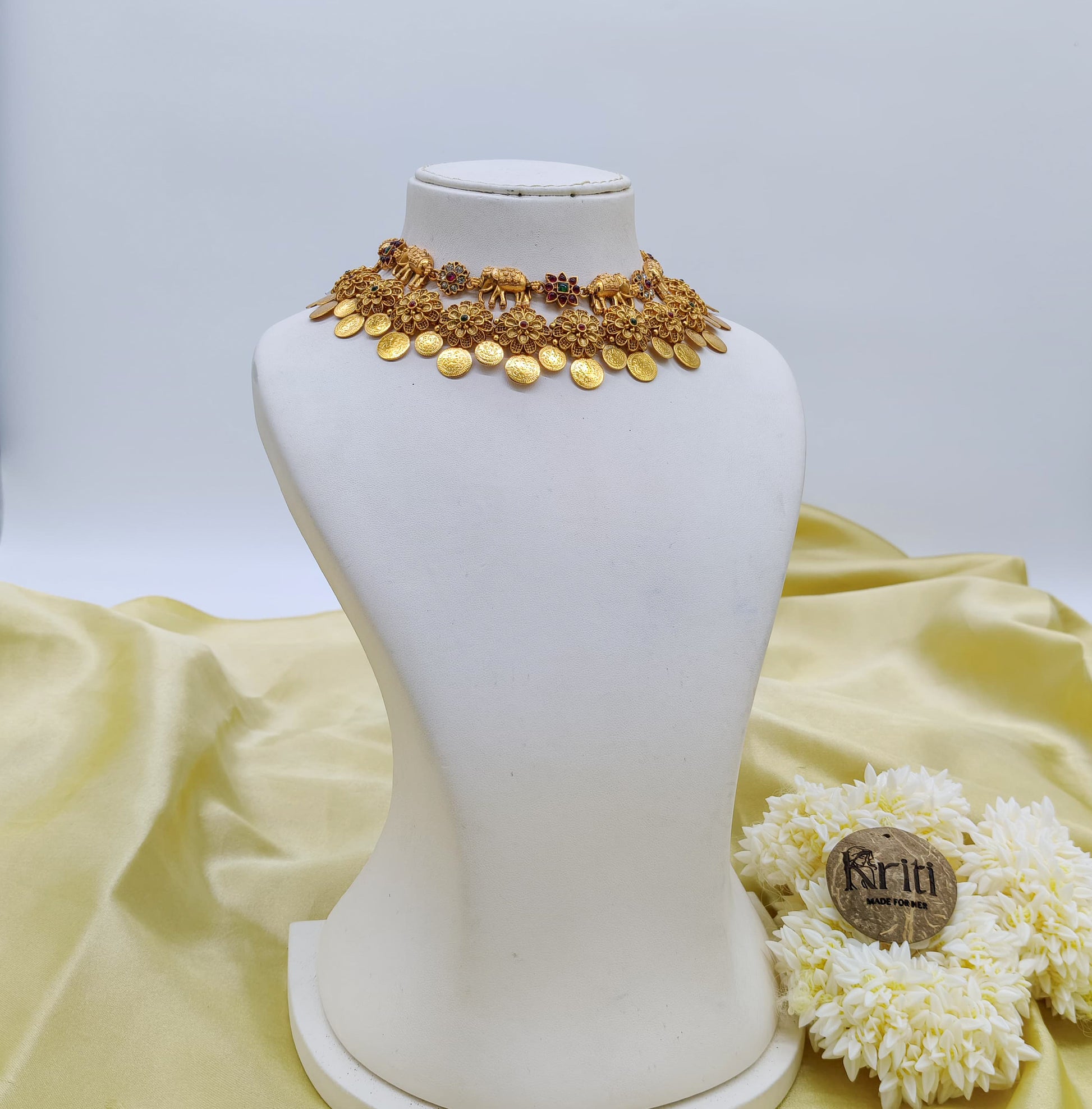 This combo set includes a temple jewellery set features a gold-toned necklace with alternating elephant motifs and red-green floral designs, paired with matching dangler earrings and a choker-style necklace features intricately crafted floral motifs, each designed with fine. Dangling from the base are elegant coin-shaped drops, adding a traditional South Indian charm to the piece with matching earrings.