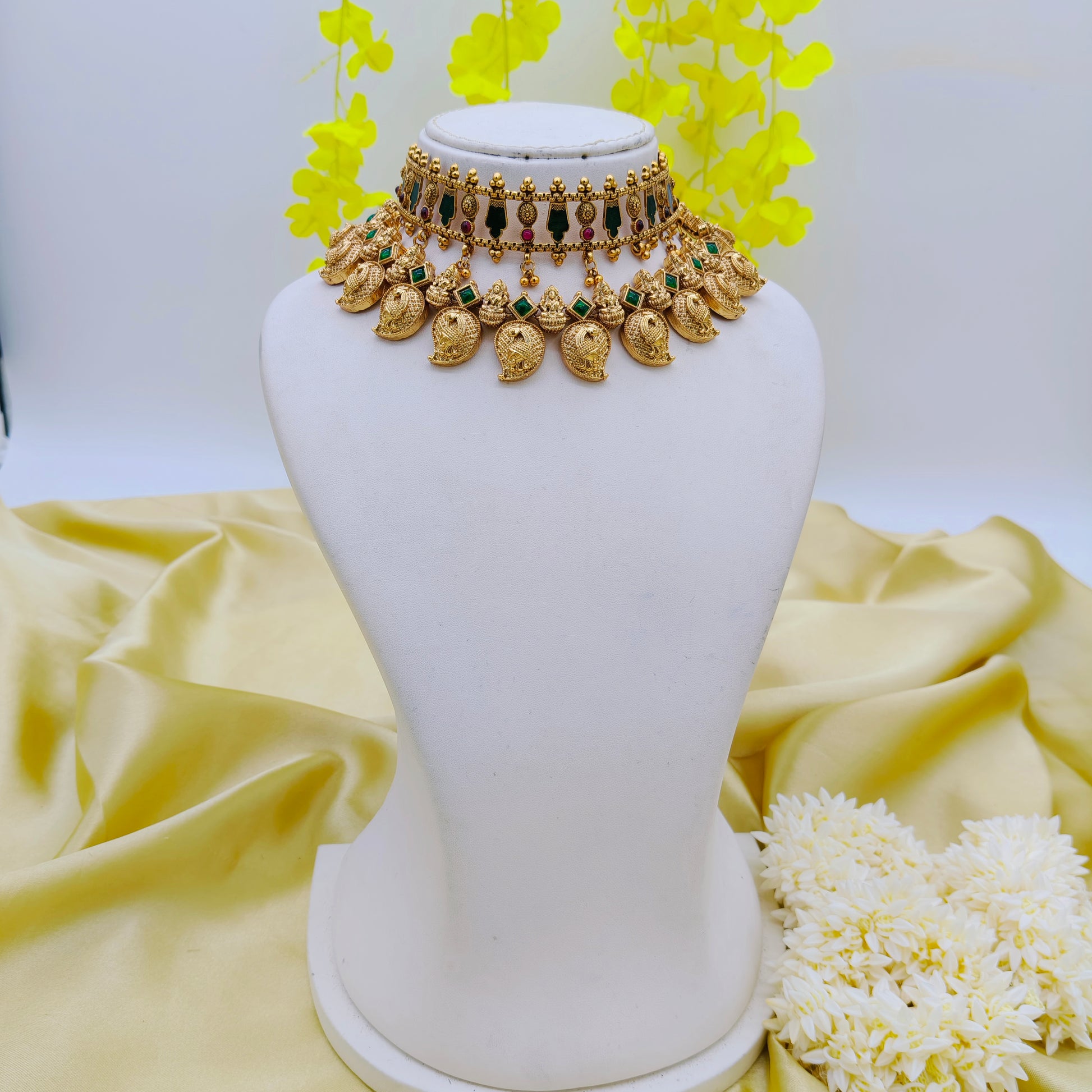 This jewellery set combo features a gold-tone choker necklace adorned with dangling motifs, green and red enamel accents, and a necklace features a series of traditional mango motifs, each intricately engraved with detailed patterns and miniature figurative designs. It comes with matching earrings that perfectly complement the necklace and the choker.