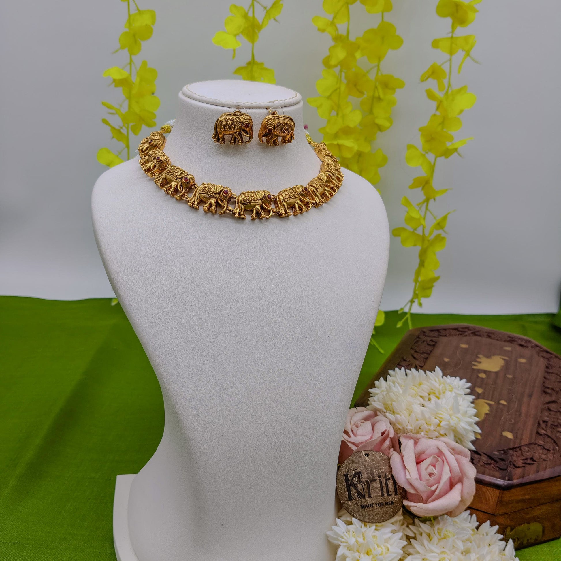 This unique jewellery set features a bold gold-finished necklace and matching earrings, both adorned with intricately crafted elephant motifs.
