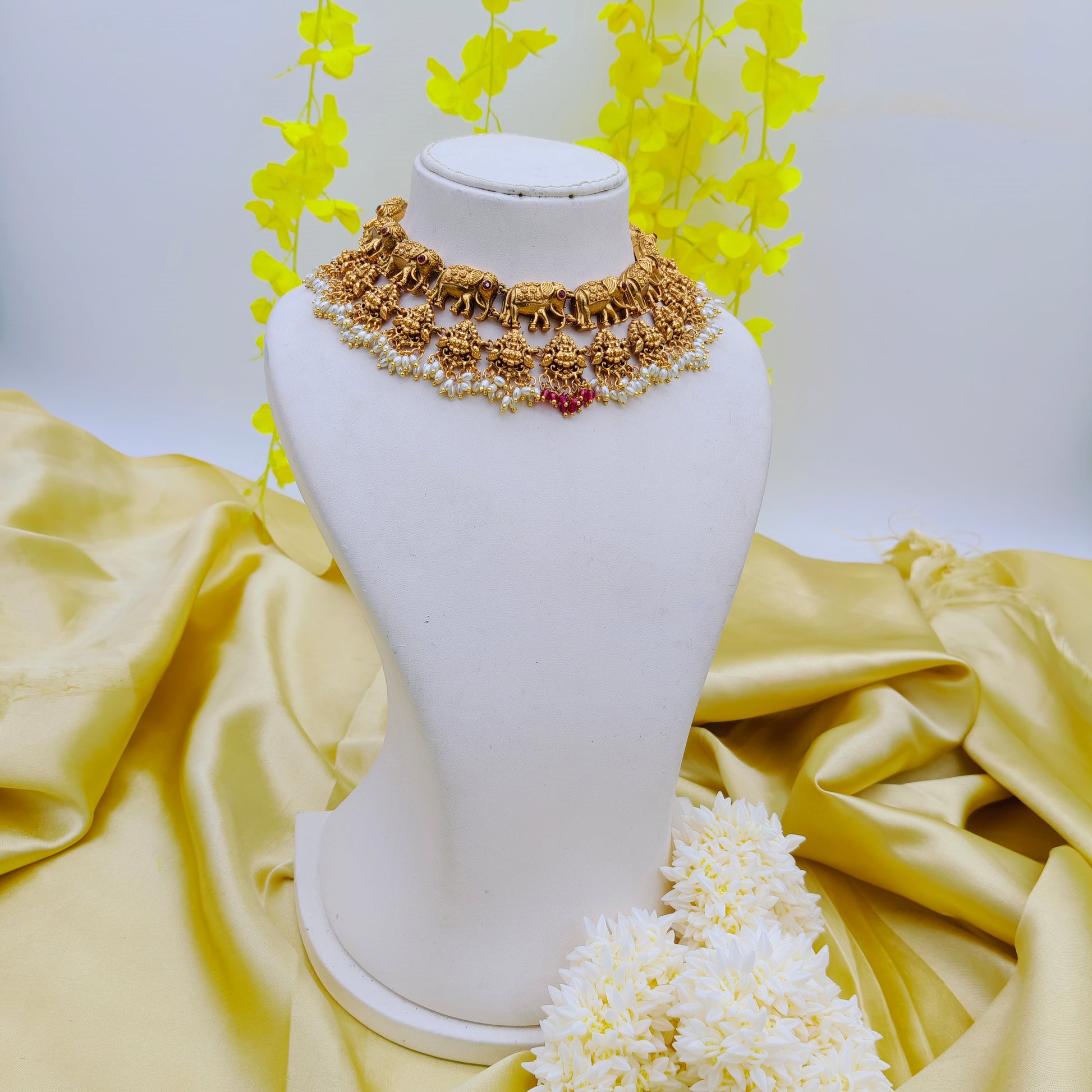 This combo includes a unique jewellery set features a bold gold- finished necklace and matching earrings, both adorned with intricately crafted elephant motifs and a set which features a traditional gold-toned necklace and matching earrings adorned with intricate motifs, pearl accents, and hints of red and green detailing, reflecting classic Indian craftsmanship and elegance.