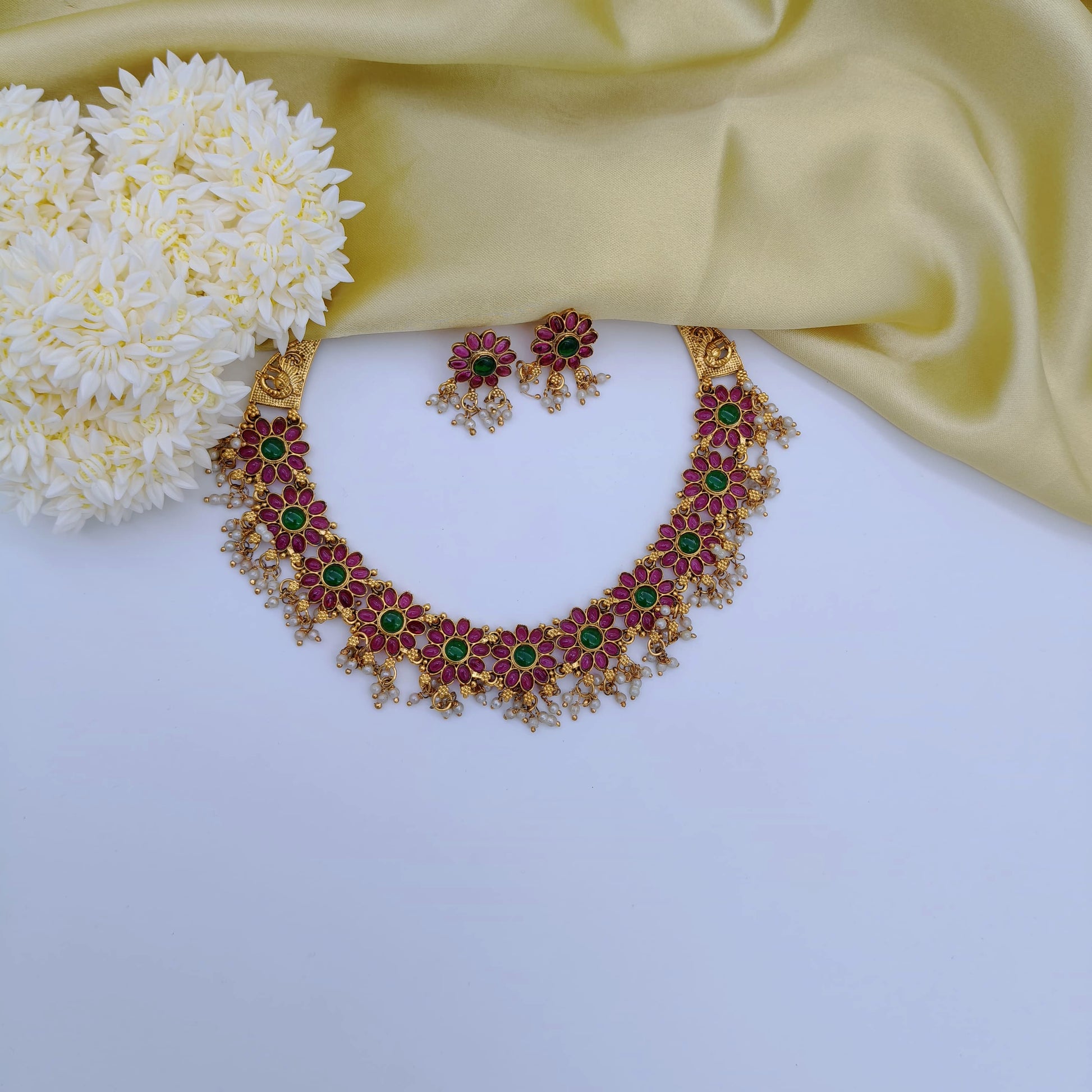 This festive necklace set features vibrant floral motifs in ruby pink and emerald green stones, finished with layers of delicate pearl droplets, and paired with matching chandelier-style earrings. Rich and eye-catching, it is perfect for weddings, receptions, and grand traditional celebrations.