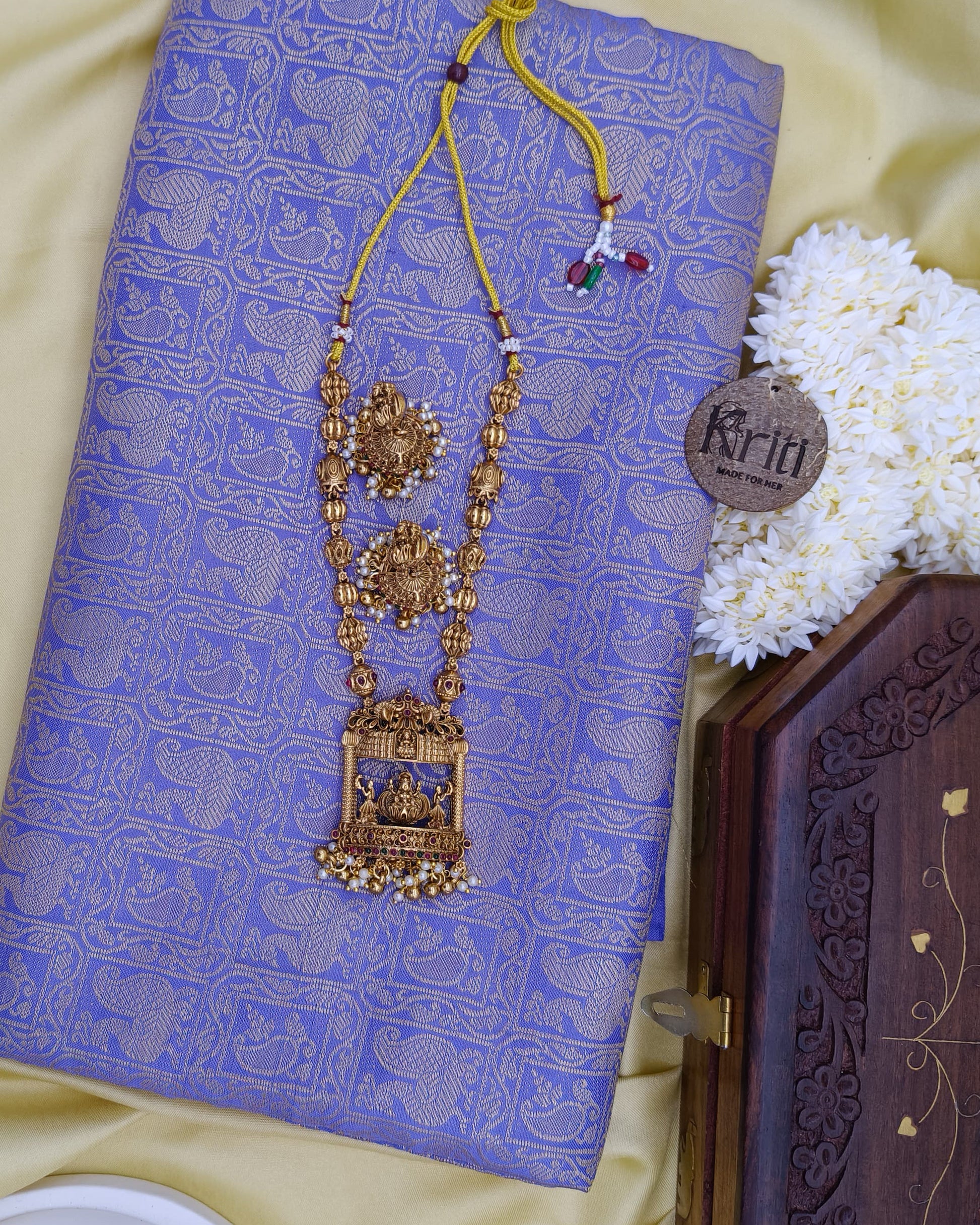 This jewellery piece is a traditional long necklace featuring a gold-toned finish with intricate motifs and temple-inspired pendants, accented by small pearls. Its unique design makes it a perfect match for ethnic outfits, adding a regal and cultural touch for special occasions or festivals.