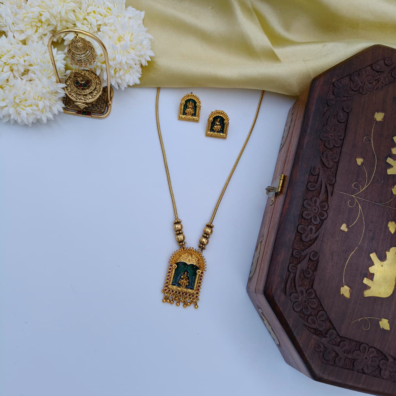 This devotional jewellery set features a sleek gold-toned chain with a temple-style pendant showcasing a deity motif framed in deep green enamel and finished with delicate bead danglings, paired with matching arch-shaped studs. Perfect for poojas and festive occasions.